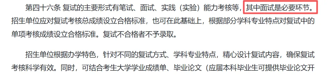 教育部在《2026年全国硕士研究生招生工作管理规定》中明确指出:复试的主要形式有笔试、面试、实践(实验)能力考核等,其中面试是必要环节。
