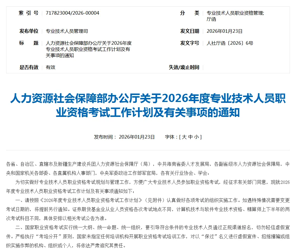 以下是链接:人力资源社会保障部办公厅关于2026年度专业技术人员职业资格考试工作计划及有关事项的通知