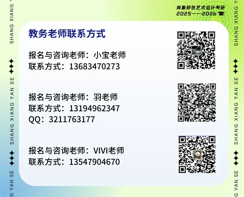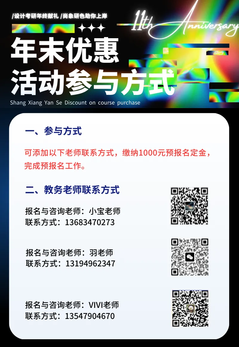 尚象研色十一年深耕设计考研教学,从系统化课程搭建、专属备考资料研发,到命题组师资精配、全流程学情服务,每一处细节的打磨,都是我们对设计考研 “高效上岸” 的深度钻研与极致追求。