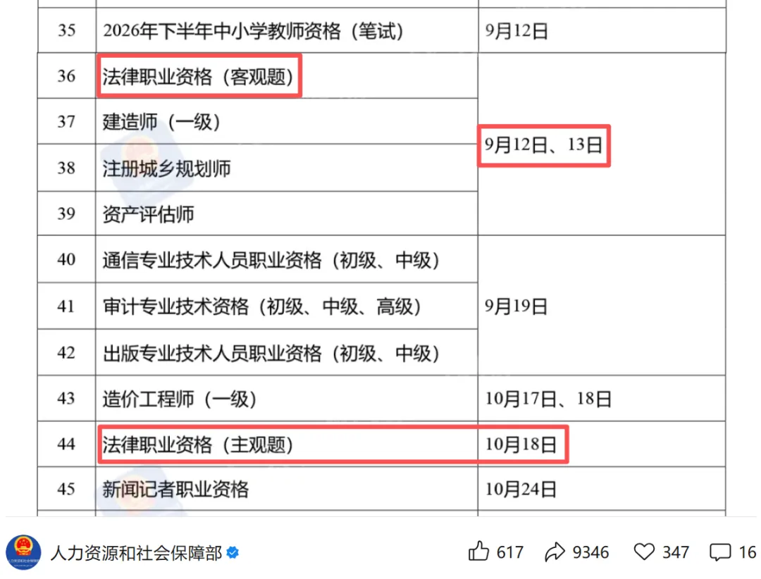 法考考试时间也在其中,根据通知,2026年法考客观题考试时间为9月12、13日,主观题考试时间为10月18日。