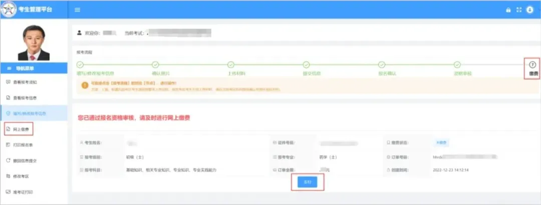 2.点击左侧【网上缴费】,核对报考专业、科目和金额,确认无误后点击“支付”跳转至考区指定的缴费平台,完成缴费。
