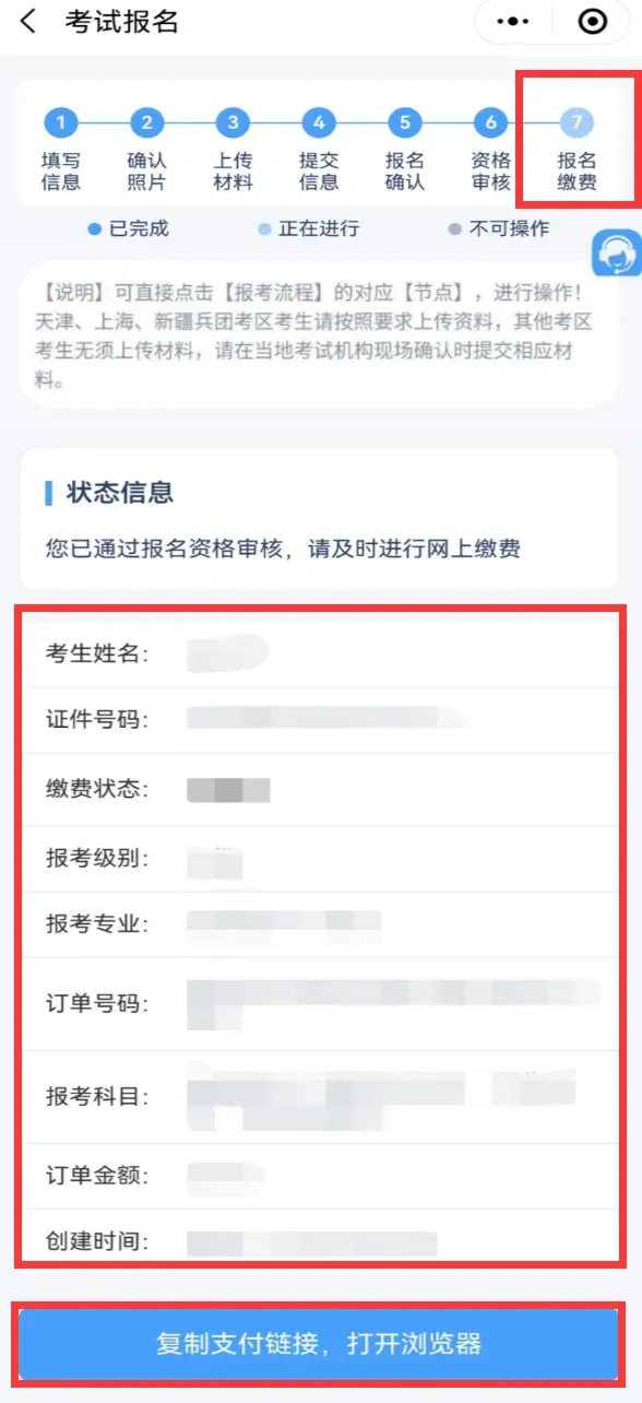 2.点击报考流程上的“报名缴费”节点,核对报考专业、科目和金额,确认无误后复制支付链接,打开浏览器,完成缴费。大家一定要记得缴费哦!