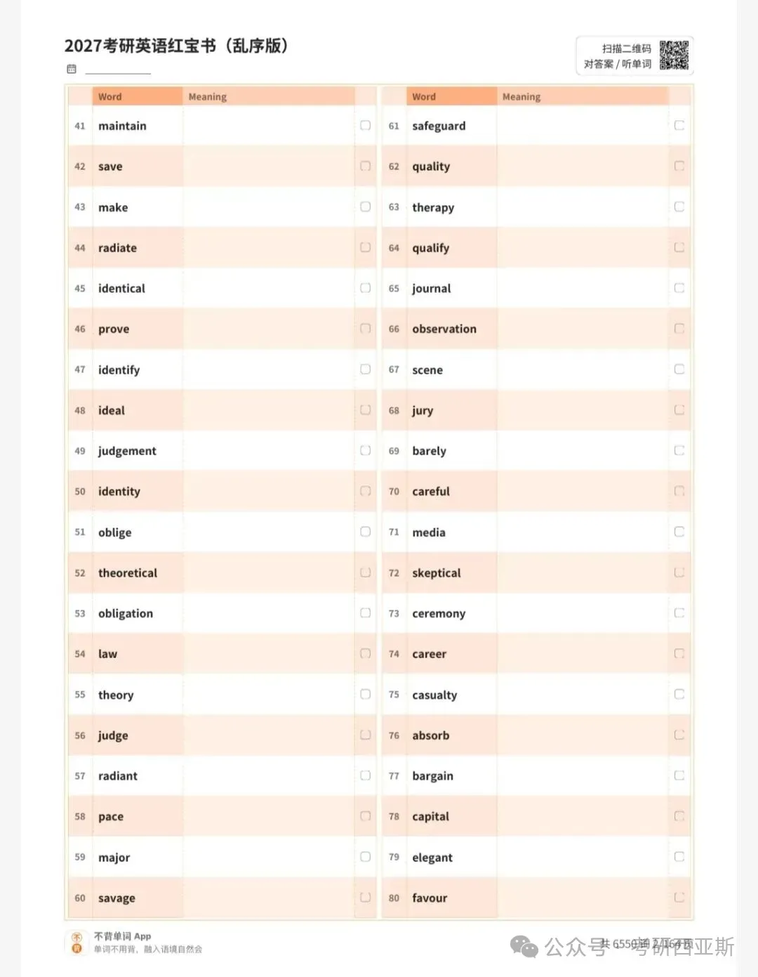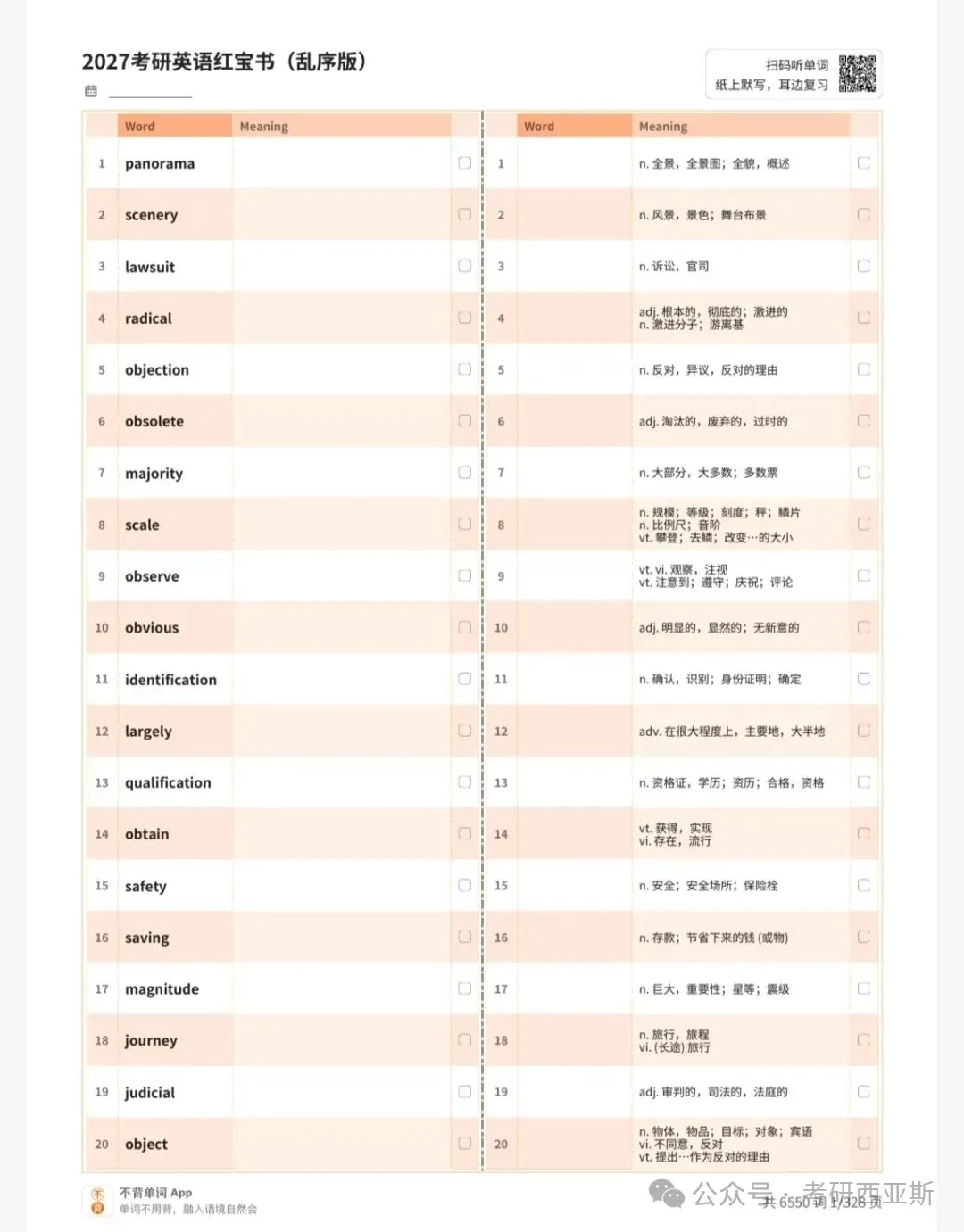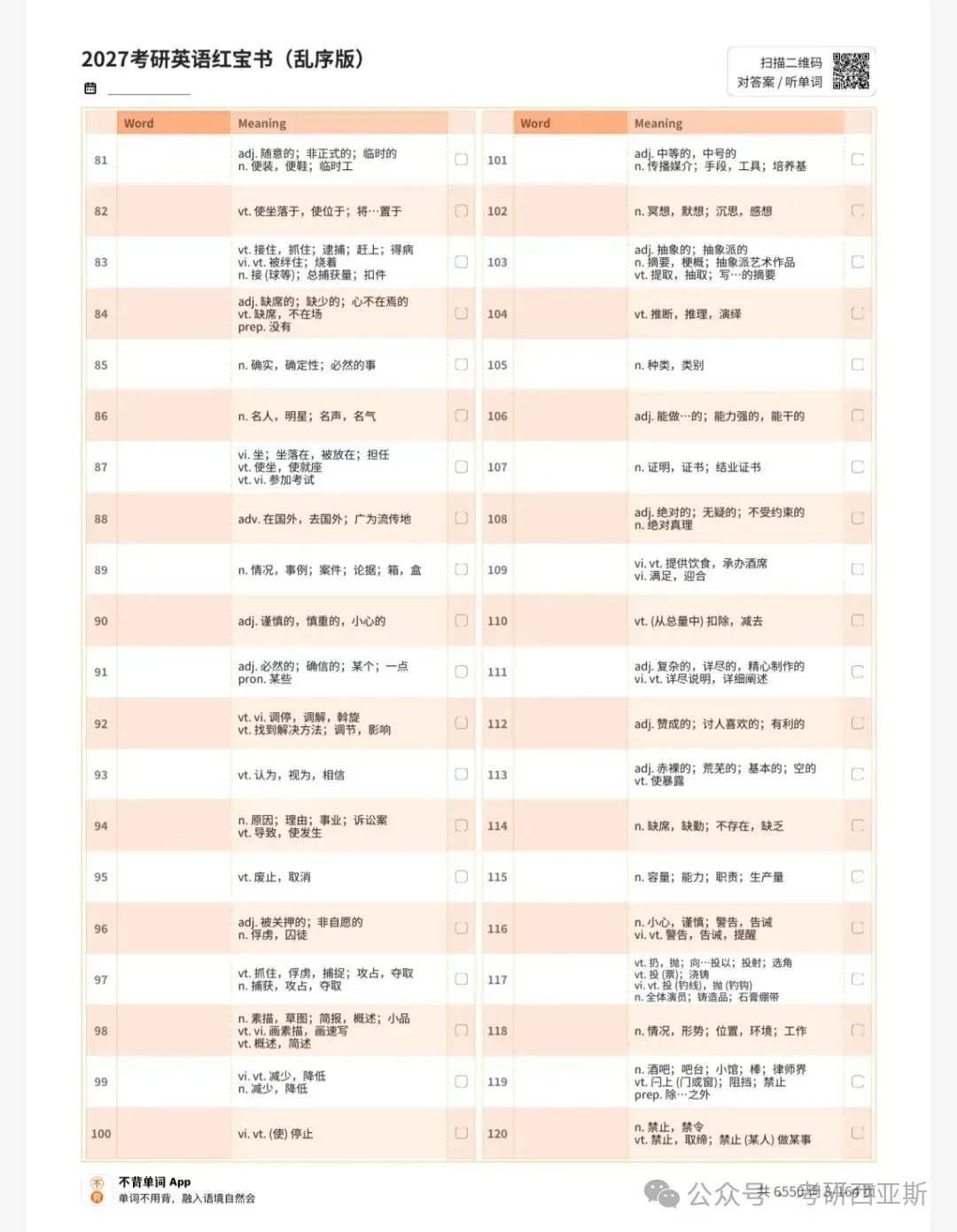 Hello!今天给大家带来了27考研《红宝书》词汇表(正序版+乱序版+默写本)!