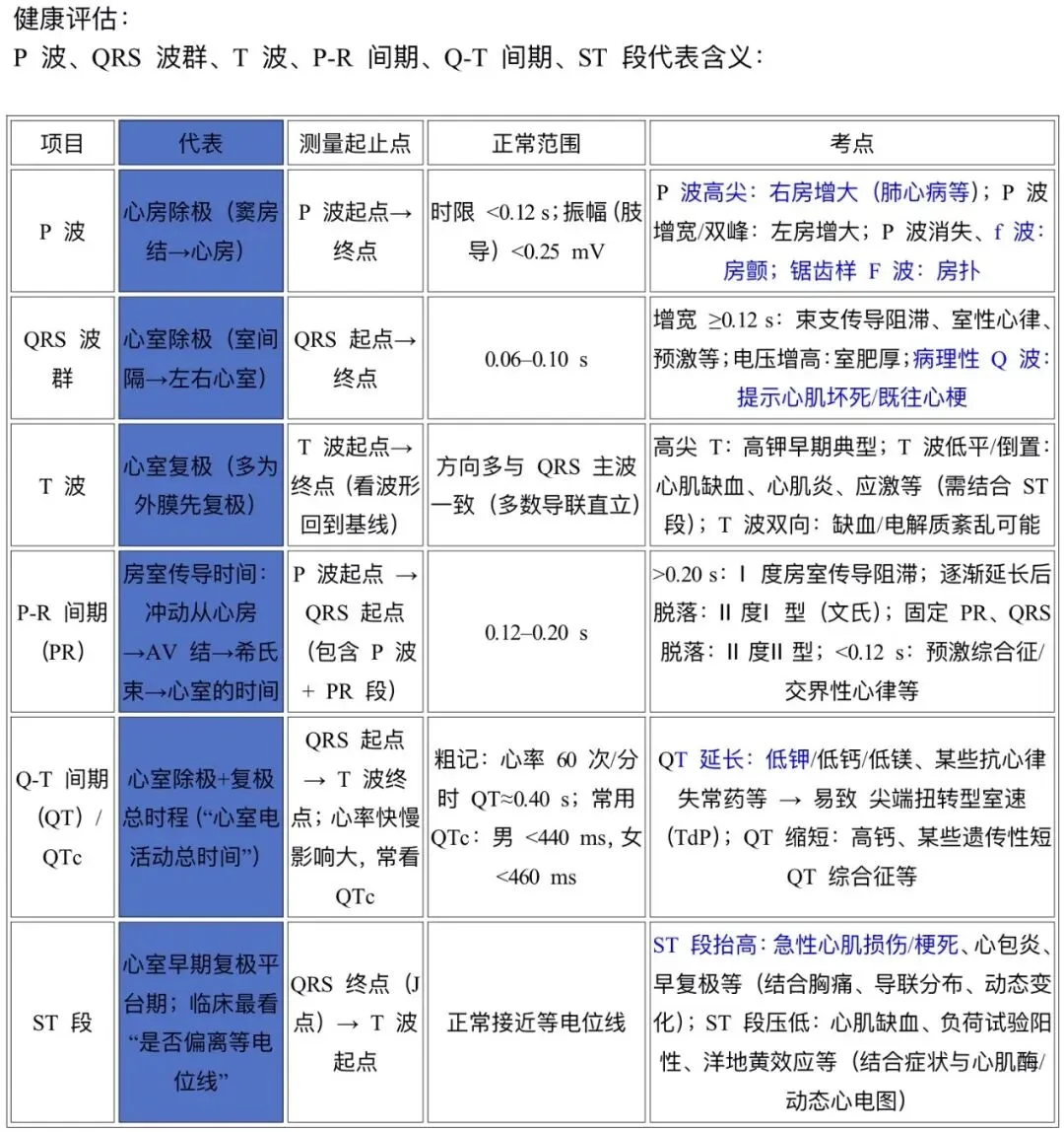 P 波、QRS 波群、T 波、P-R 间期、Q-T 间期、ST 段代表含义: