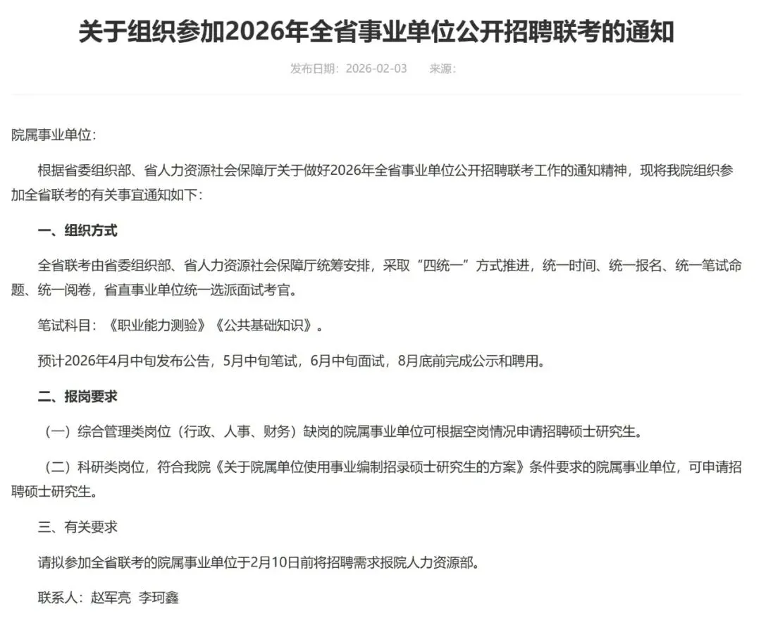 河南省科学院人力资源部(党群工作部)关于组织参加2026年全省事业单位公开招聘联考的通知根据省委组织部、省人力资源社会保障厅关于做好2026年全省事业单位公开招聘联考工作的通知精神,现将我院组织参加全省联考的有关事宜通知如下: