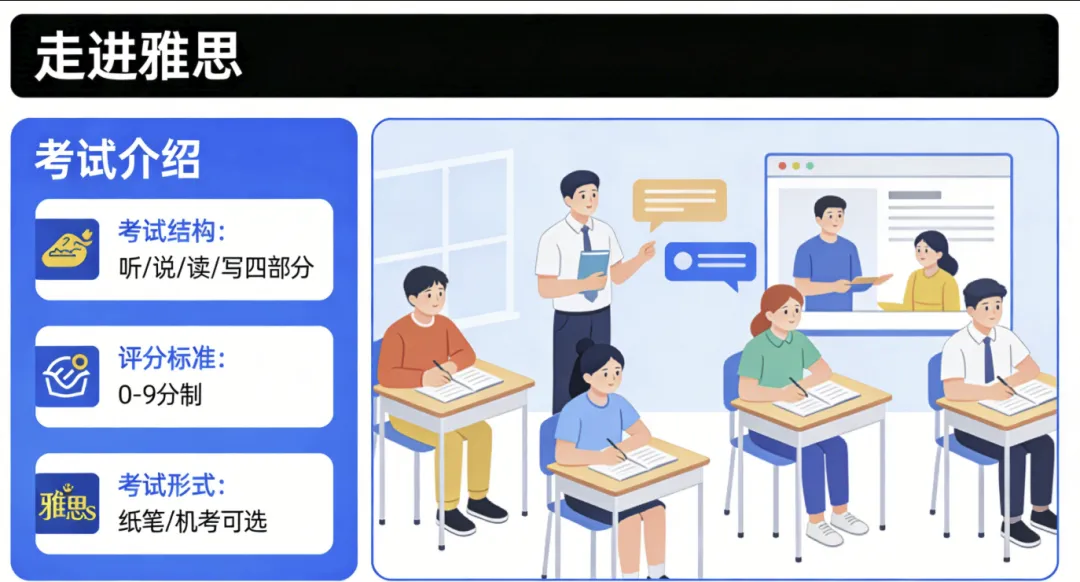 雅思(IELTS,国际英语语言测试系统)是全球权威的英语语言能力测试,由剑桥大学英语考评部、英国文化教育协会、IDP教育集团联合管理,覆盖听、说、读、写四模块,总分 9 分,广泛用于留学、移民、职业发展等场景。