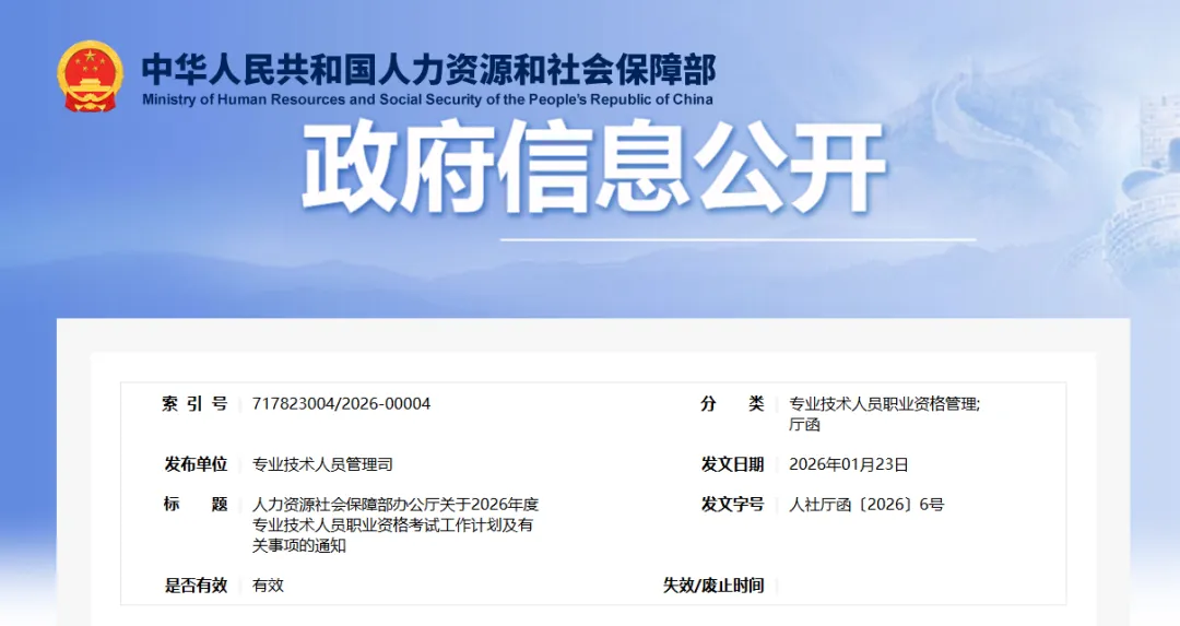 人力资源社会保障部办公厅关于2026年度专业技术人员职业资格考试工作计划及有关事项的通知
