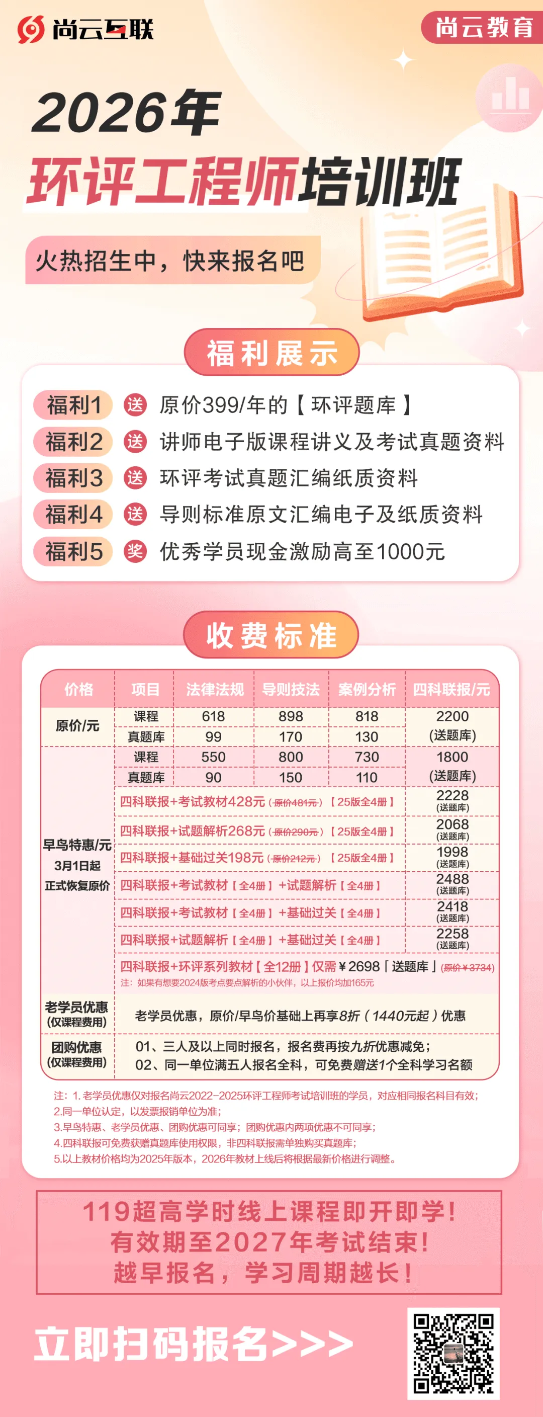 感谢大家长期以来对我司环评培训工作的关注与支持!为帮助大家更高效应对2026年环评工程师考试,兼顾备考的系统性与针对性,同时全面升级学习体验,现就2026年度尚云环评培训课程安排及多项服务升级说明如下(越早报名,学习周期越长):