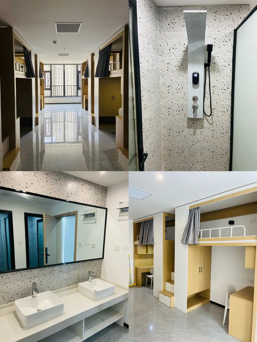 为四人间,上床下桌的单人床位,配备独立窗帘和0.9×2.0米床位,需自行准备床铺和台灯。