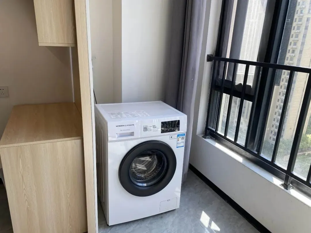 每间宿舍配1台洗衣机,需扫码付费使用,宿舍区有晾晒区;采用中央空调,由宿舍自行控制,无需支付空调费,但规定学习时间内不能开空调,也不允许在宿舍逗留;洗漱区配备两个洗漱面盆,卫生间与淋浴间实现干湿三分离。