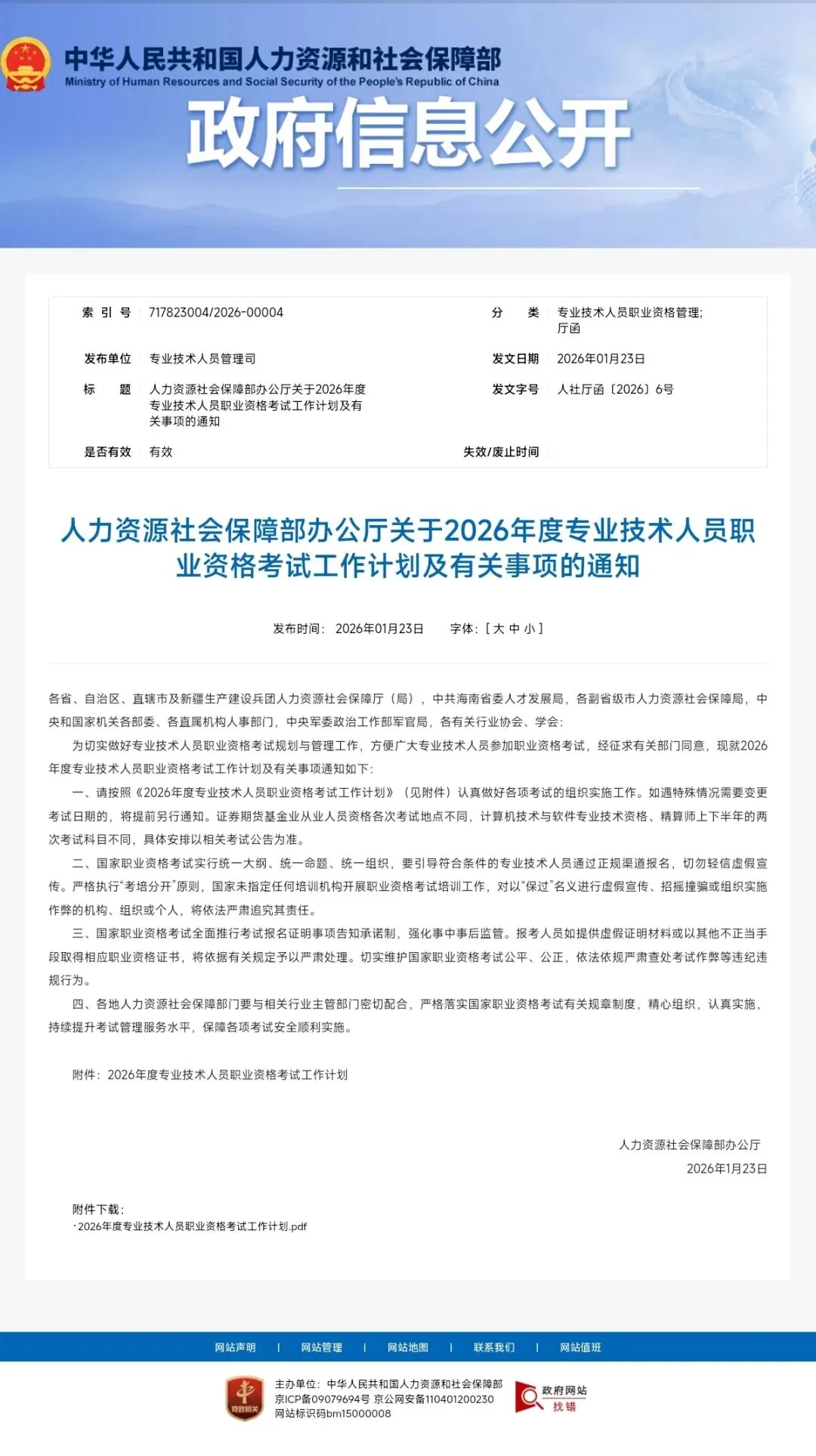 2026年度专业技术人员职业资格考试工作计划及有关事项的通知