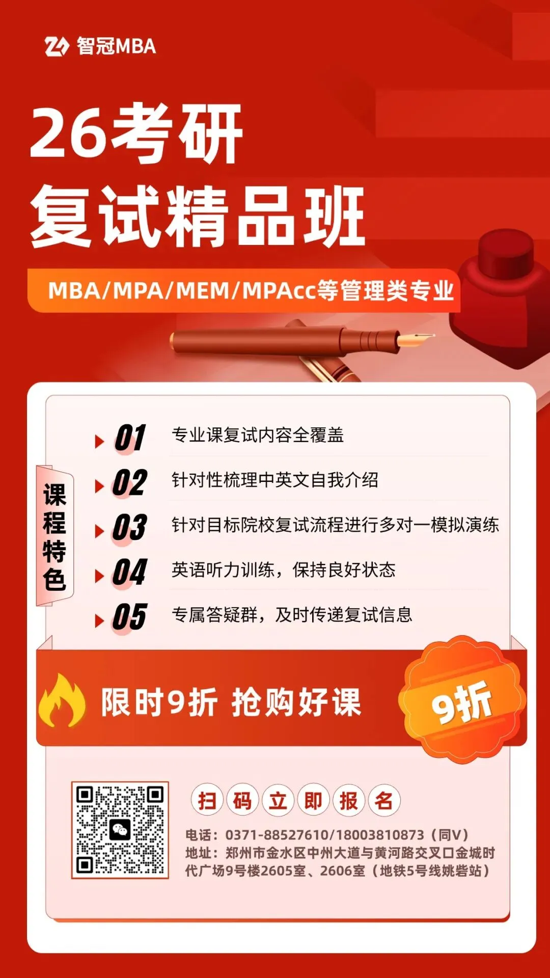 不要着急,智冠MBA免费为大家提供1V1在线咨询服务,免费择校评估,院校推荐,定制专属备考计划,让你心里有底,从容备考!👇
