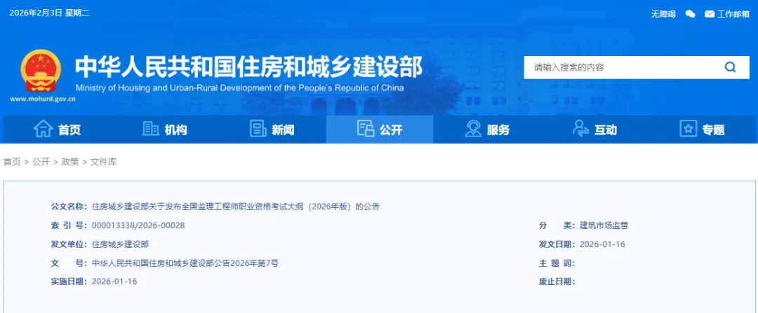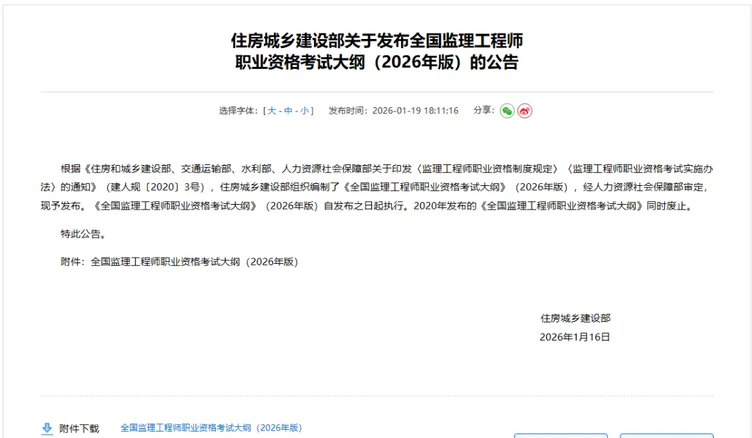 2026年1月16日,住房和城乡建设部发布《全国监理工程师职业资格考试大纲》(2026年版),自发布之日起执行,2020年版同时废止。此次大纲修订间隔六年,适逢我国建筑业转型升级的关键时期,其意义远超常规的知识更新范畴。考试大纲作为职业资格制度的纲领性文件,规定了监理工程师应具备的知识结构与能力体系,对行业发展具有鲜明的导向作用。