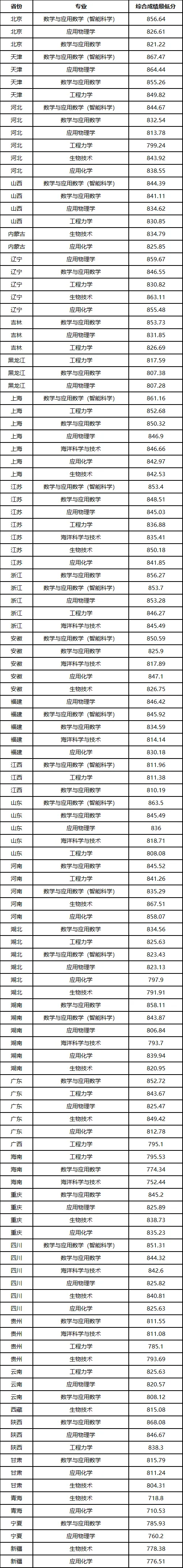 综合成绩=高考成绩÷高考满分×850+校测成绩。校测成绩满分150分,其中初试成绩满分100分、复试成绩满分50分;对第二类考生,校测成绩即复试成绩(满分150分)。