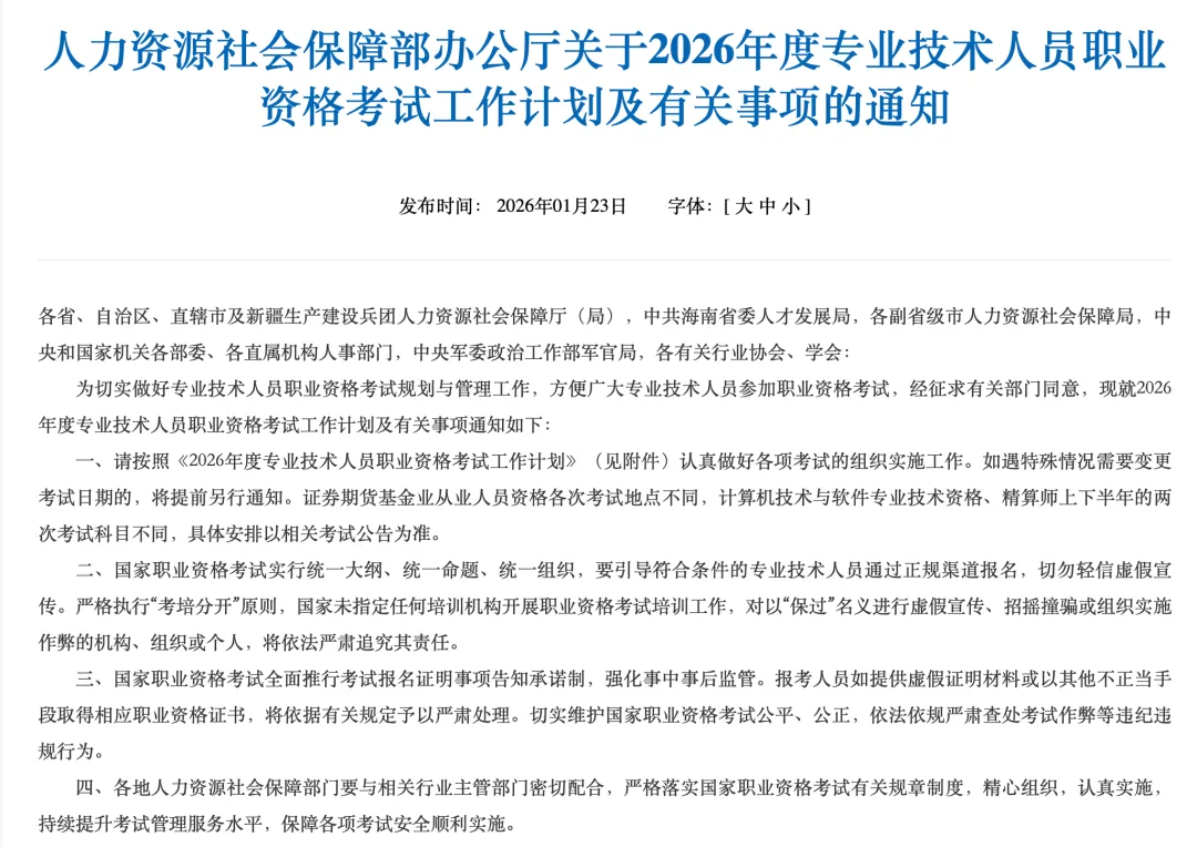 近日,人力资源社会保障部办公厅印发《2026年度专业技术人员职业资格考试工作计划》,明确了明年全国计算机技术与软件专业技术资格(水平)考试(以下简称“软考”)的具体时间。根据安排,2026年软考将继续实施一年两考,上半年考试定于5月23日至5月26日举行,下半年则安排在10月24日至10月27日。值得关注的是,下半年考试时间较以往惯例提前约两周,考生需据此合理安排复习节奏。