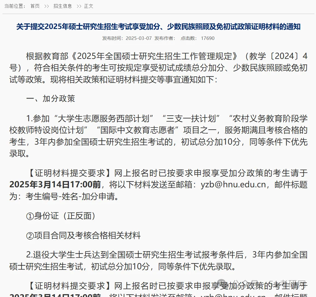 注意,满足以上加分政策的考生,一般在初试成绩公布后,复试分数线公布前,高校会发提交材料的通知,一定要在规定的时间内按照要求提交相应的证明材料,审核通过之后,可以加分。(如果学校官网没有发布,要在初试成绩公布后,主动联系学校提交材料。)