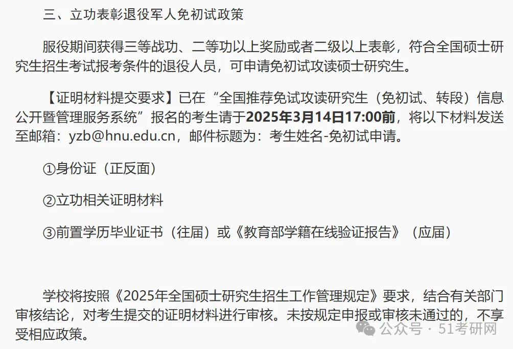 服役期间获得三等战功、二等功以上奖励或者二级以上表彰,符合全国硕士研究生招生考试报考条件的退役人员,可申请免初试攻读硕士研究生。