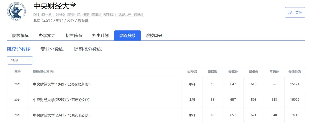 志愿填报|中央财经大学2025年在河北省录取分数线及排名(物理、历史)