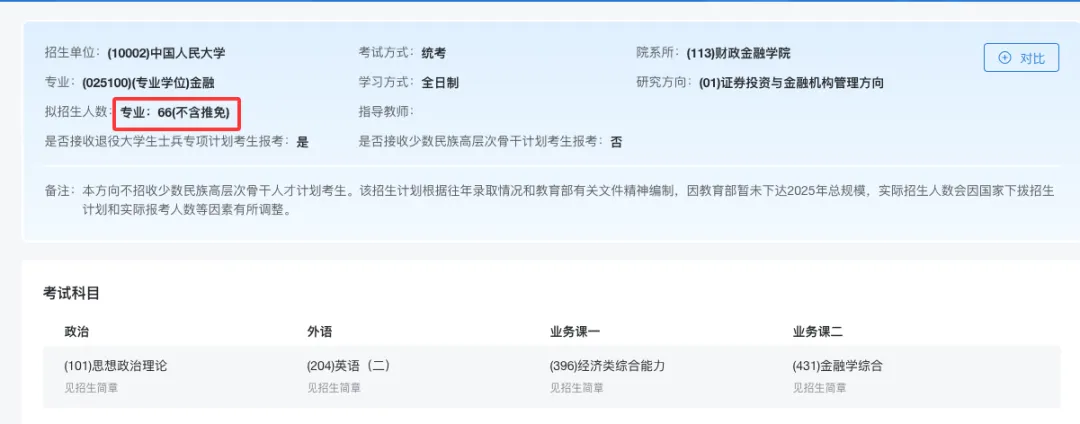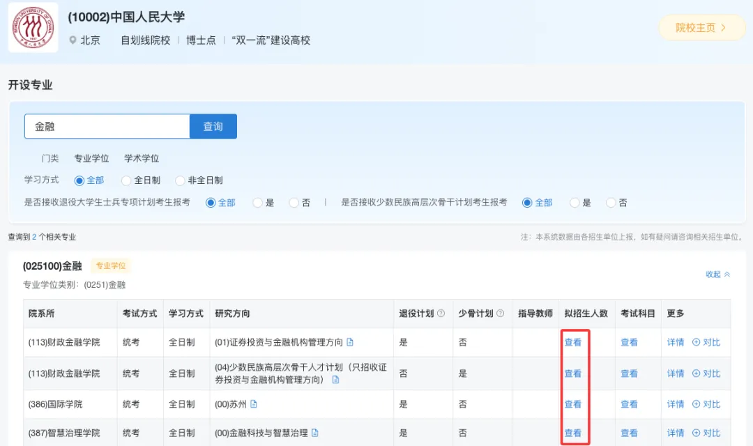 建议优先选择招生规模 ≥10 人的方向,个位数招生易因推免或校内调剂缩水。下文皆以中国人民大学的金融专业为例: