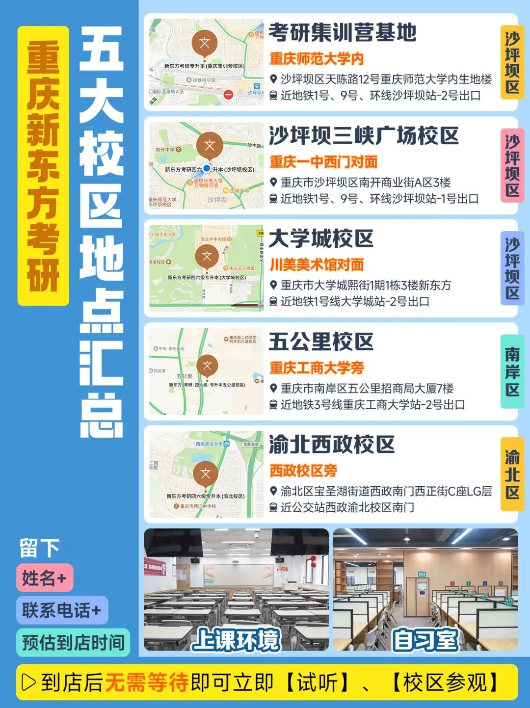 📞19122977265 我们专为重庆本地考研学子 提供备考规划、真题解析、1对1咨询,助你高分上岸! 重庆主城四大校区火热开课中! 课程咨询请拨打:19122977265! 👇👇👇 新东方考研四六级专升本沙坪坝校区 新东方考研四六级专升本五公里校区 新东方考研四六级专升本(大学城校区) 新东方考研四六级专升本渝北校区 点击【阅读原文】
