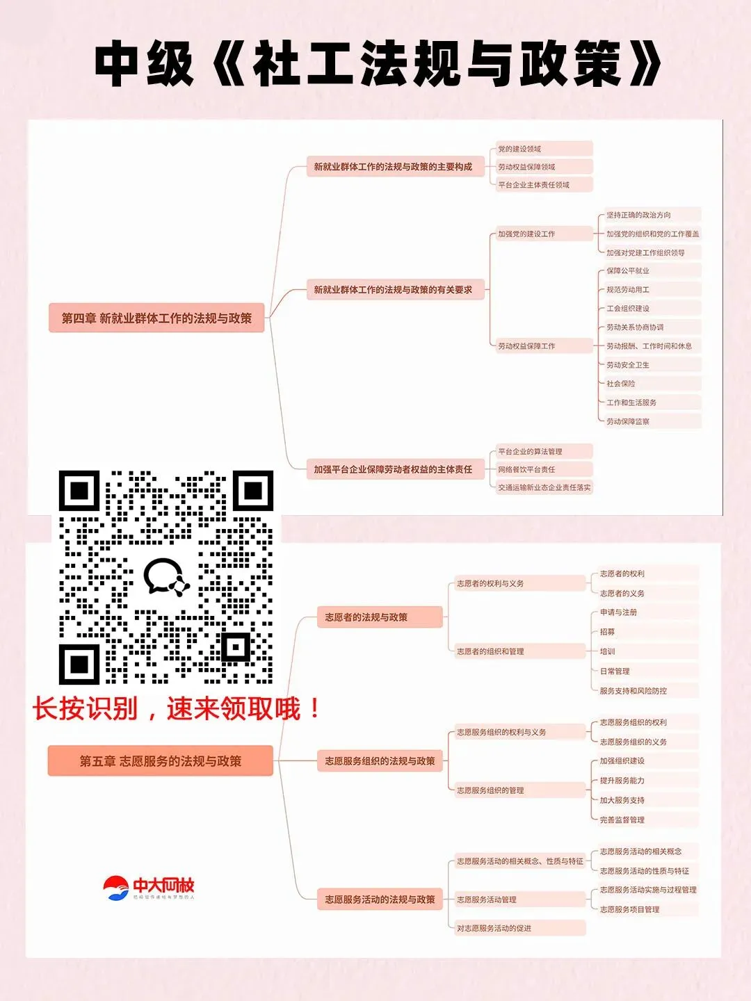 2026年社会工作师考试新版教材章节繁多、知识点庞杂,中大网校社会工作师考试教研团队依据最新考纲与命题规律,针对人民大学出版社版本教材精心研发了初中级社工考试各科目教材章节思维导图,帮助考生化繁为简,构建清晰的知识体系,实现高效备考,考生可添加助教老师微信咨询获取哦。