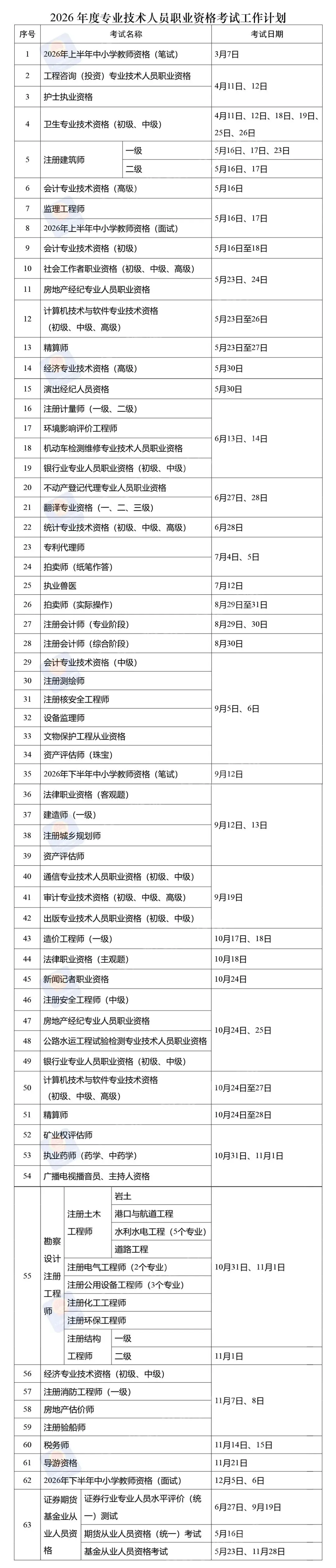 近日,人力资源社会保障部办公厅印发《关于2026年度专业技术人员职业资格考试工作计划及有关事项的通知》。