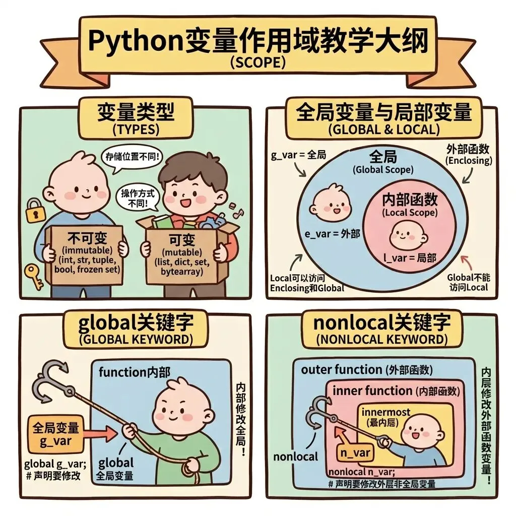 总结:今日我们学习了Python基础篇-变量的作用域:通过学习变量的作用域,我们认识了Python中的4种作用域类型,明确了作用域的查找规则,也学习了global和nonlocal的使用方法及其场景。在Python基础篇,后续我们将持续学习Python基础知识,祝每一位study er学习愉快。