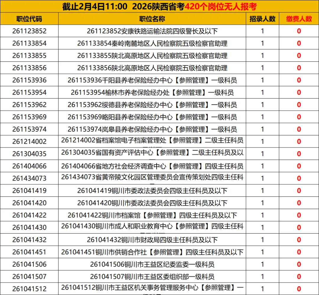 2026陕西省公务员考试无人报考岗位表