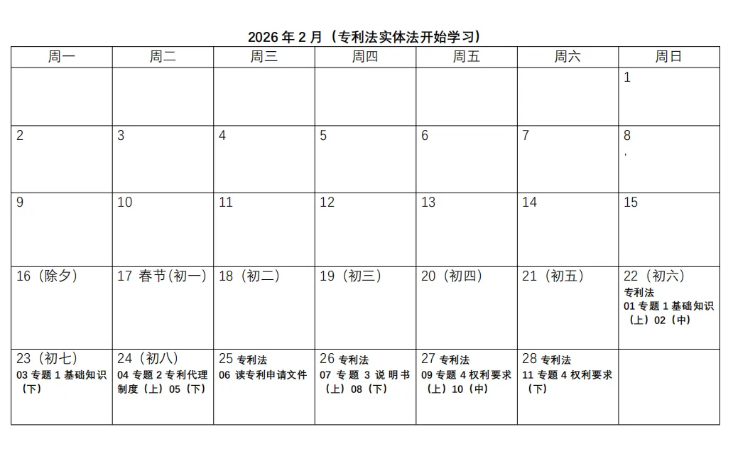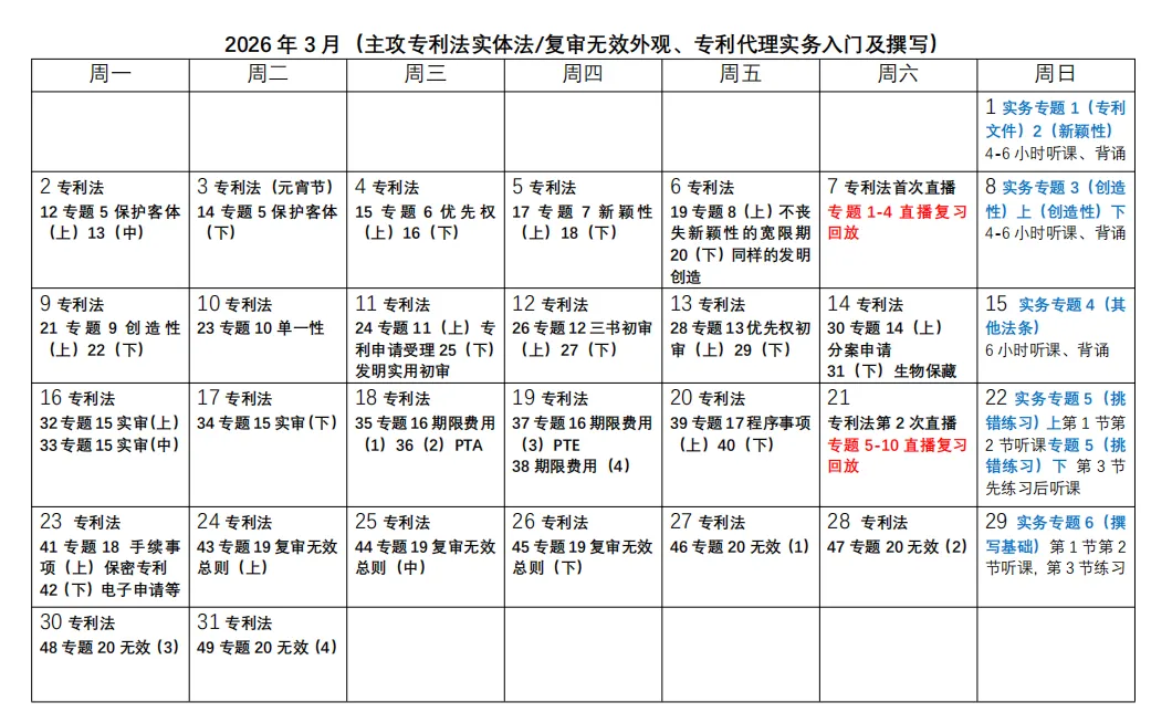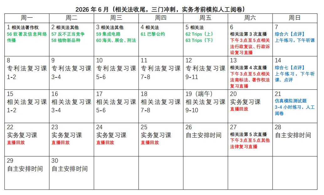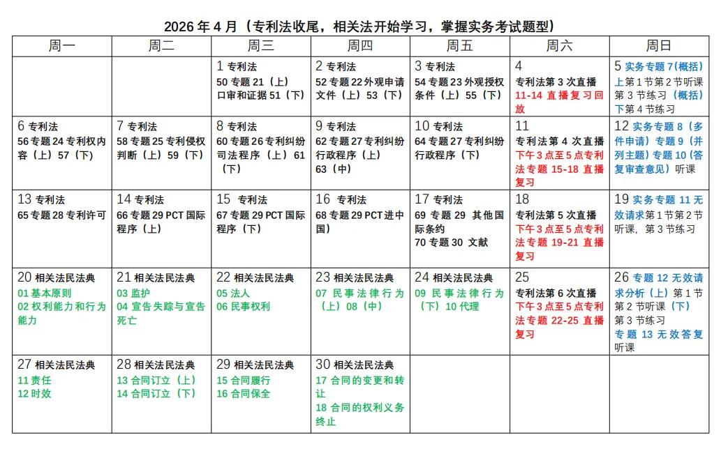 3. 表格中黑色字为专利法学习时间,蓝色字为实务学习时间,绿色字为相关法学习时间,红色字为直播时间。