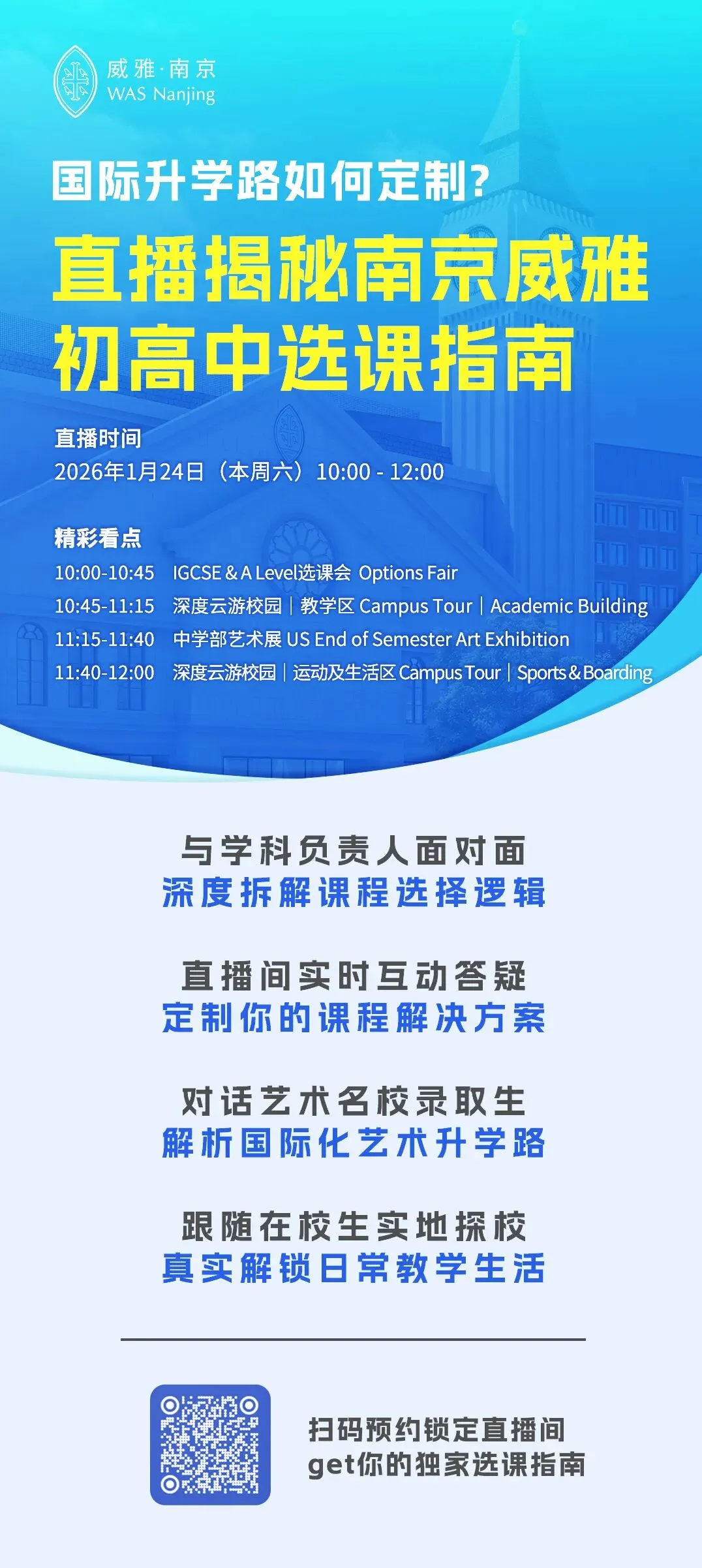 别慌!💡1月24日(本周六)10:00-12:00,南京威雅「选课指南」专场直播来了!把你关心的「选课逻辑、升学路径、国际化学校真实生活」一次性讲透!