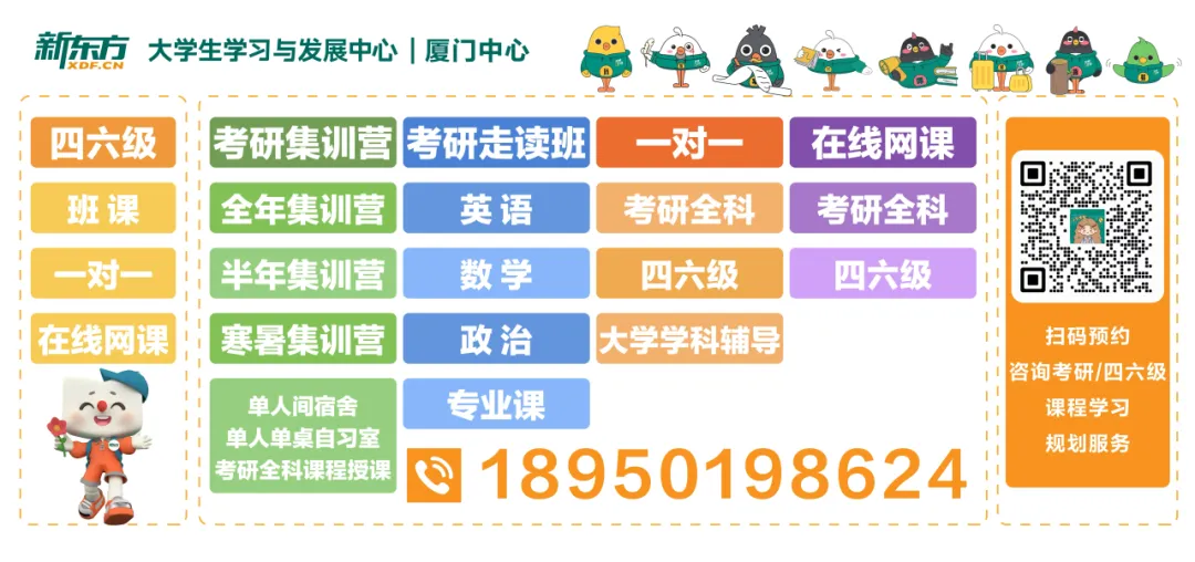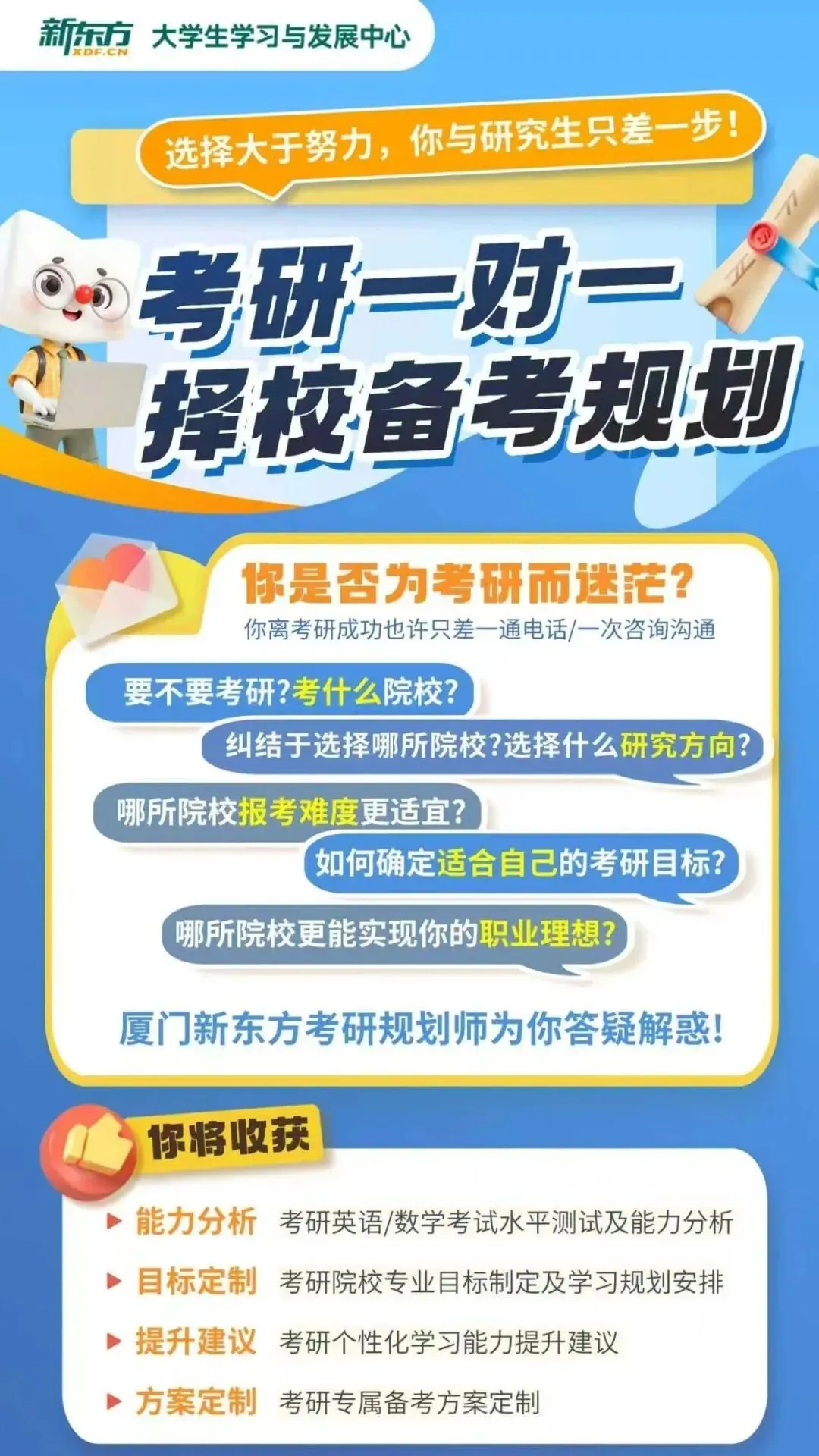 厦门新东方考研规划师团队近十年来一直致力于考研考情研究,针对每位考研er不同的学习情况和目标方向,给予科学的考研方向和备考安排。