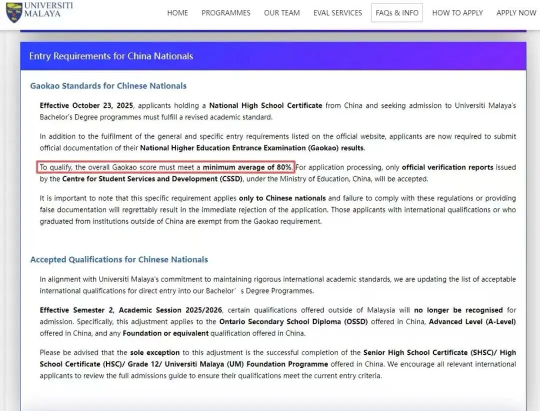 马来亚大学官方发布的最新通知明确:本科录取对中国学生的高考成绩要求,正式从总分70%上调至80%(750分制对应600分,海南900分制对应720分,上海660分制对应528分),该政策即刻生效,适用于所有未完成申请审核的中国本科申请者。校方同步强调,此次调整是为适配学校QS排名提升后的优质生源需求,进一步优化生源结构。