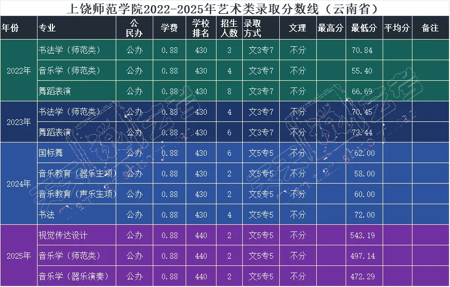 上饶师范学院艺术类招生专业有音乐学、舞蹈学、广播电视编导、美术学、书法学、环境设计、舞蹈表演等专业,近年在云南省招生专业每年都有变化,具体招生专业、人数和录取分数如下: