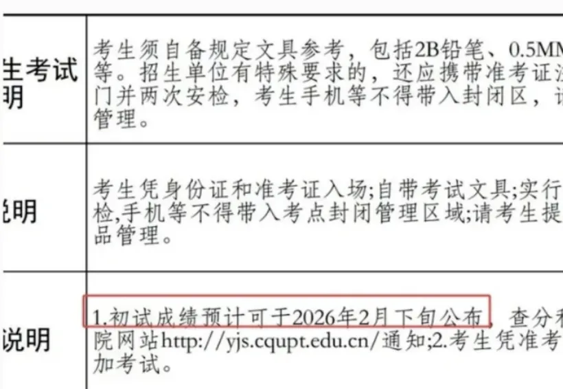 重庆邮电大学在考研初试准考证中透露了2026考研初试成绩查询的时间,提到26考研初试成绩查询方式预计在2026年2月下旬。