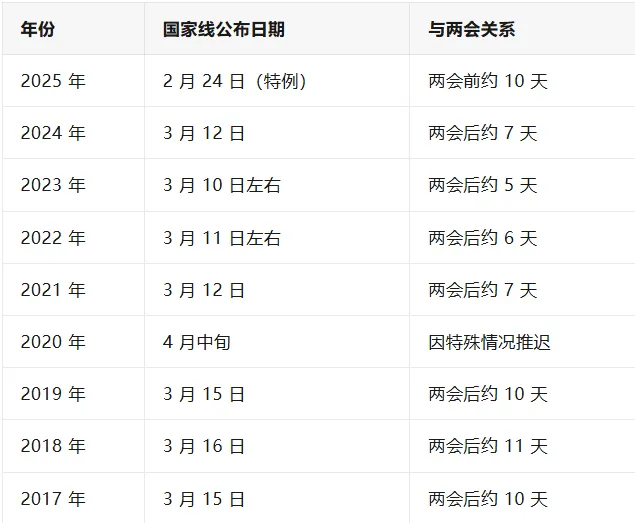 考研国家线公布日期总体稳定,除2020年受大环境影响推迟外,其余年份国家线均在3月中旬公布。而且基本遵循“二五定律”,即公布日期基本是在周二或者周五。同时,考研国家线公布日期通常是在全国两会结束前后,全国两会通常在3月3日左右召开。综上,2026年考研国家线公布日期可能是2025年3月16日-3月21日。
