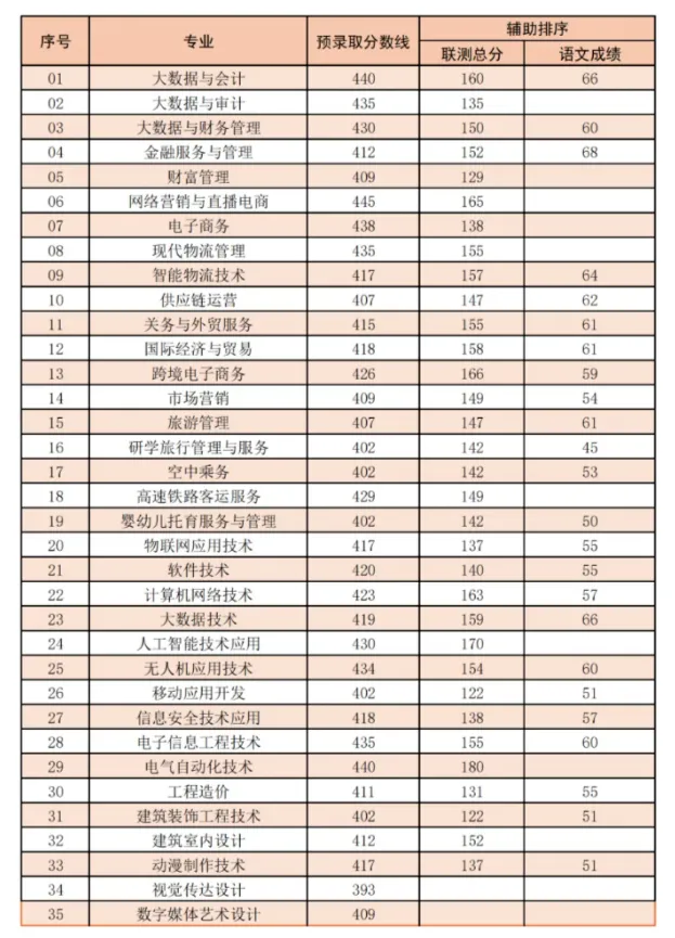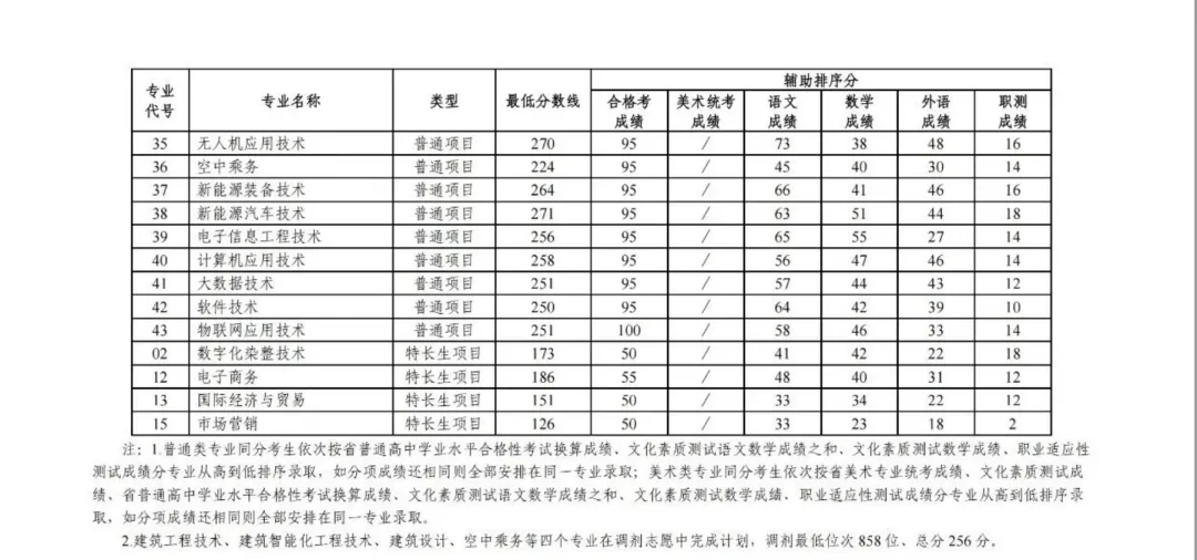 备注:艺术(美术)类专业:若总分相同,按考生美术类专业省统考成绩录取,如仍相同,按考生单科素描、速写、色彩成绩顺序排序录取。备注:普通类专业:若总分相同,按考生文化素质测试成绩单科语文、数学、职测成绩顺序排序录取。