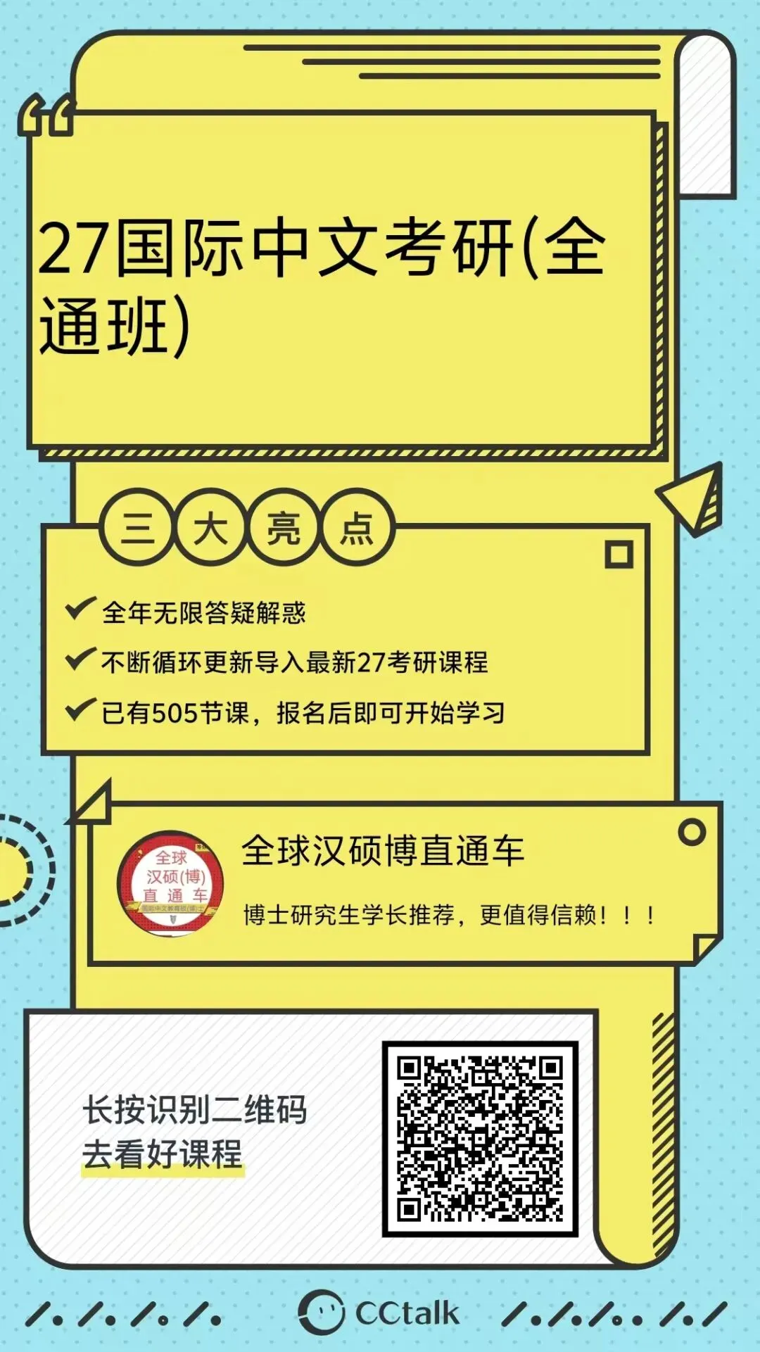 通知:为最(大)限度回馈广大考研学子,最(大)限度帮助学员快速考上目标院校研究生,推动国际中文教育事业的快速发展,全球(国内外)汉硕博直通车特推出 27 国际中文考研全通班,仅需 999 元,包含以下内容: