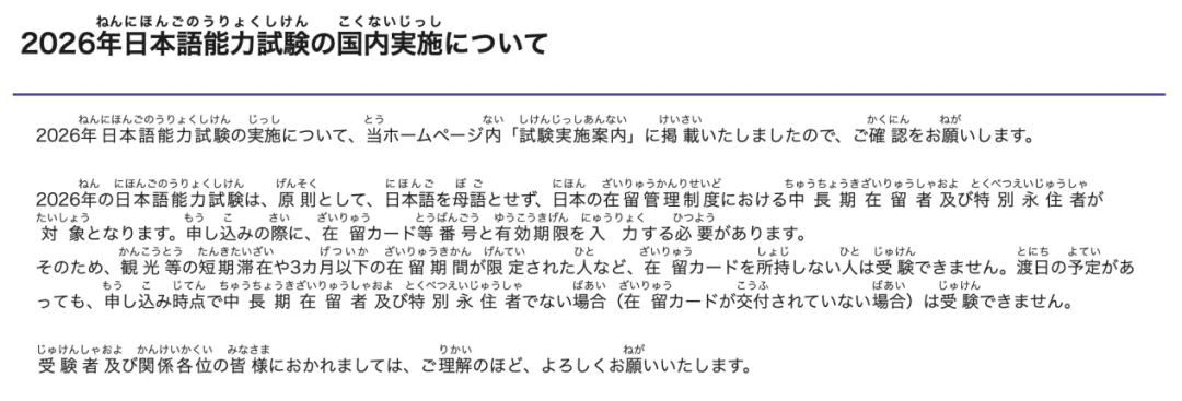 2026年的日语能力考试,原则上仅面向非日语母语者、且持有日本在留管理制度中的中长期在留资格或特别永住者。报名时需输入在留卡号码及其有效期限,请务必提前准备。