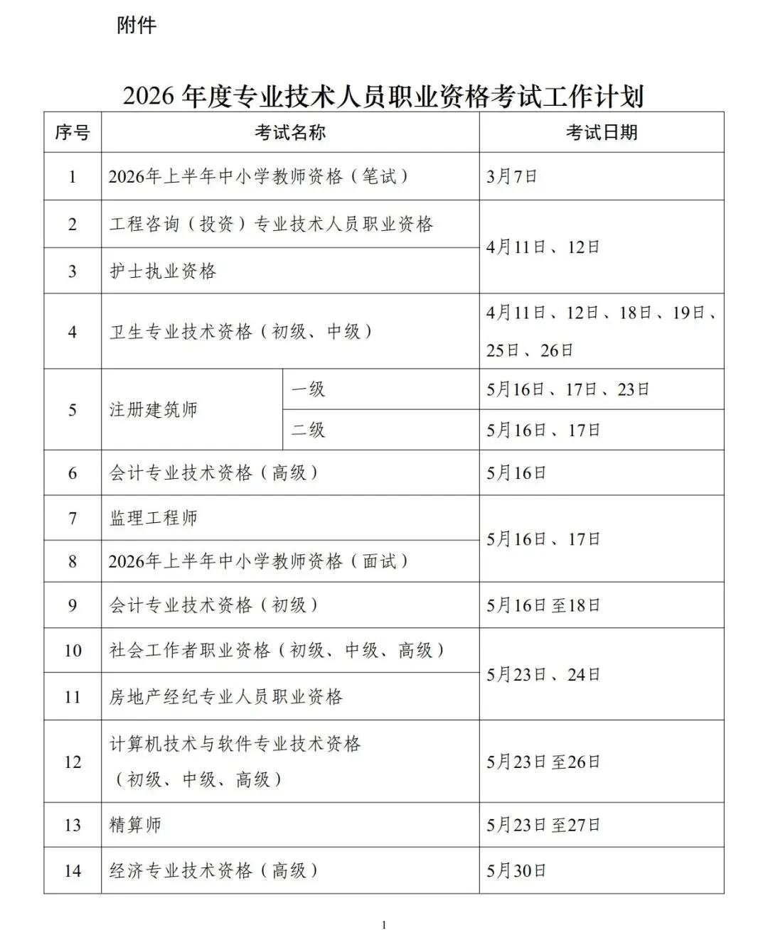为切实做好专业技术人员职业资格考试规划与管理工作,方便广大专业技术人员参加职业资格考试,经征求有关部门同意,现就2026年度专业技术人员职业资格考试工作计划及有关事项通知如下: