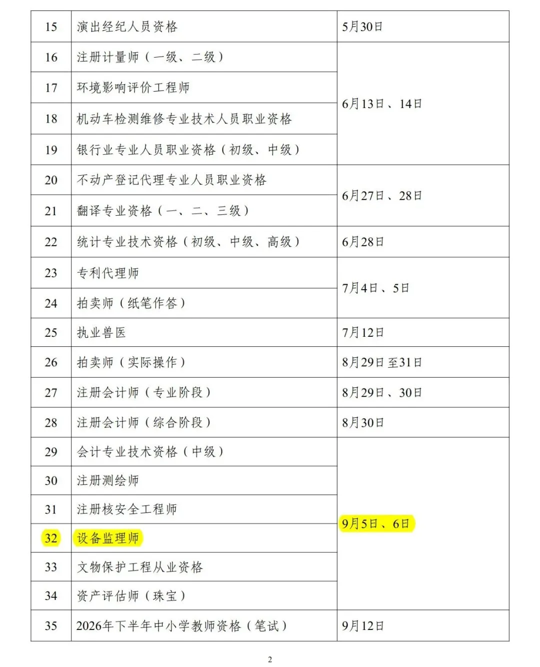 近日,人力资源社会保障部办公厅正式印发《关于2026年度专业技术人员职业资格考试工作计划及有关事项的通知》(人社厅函〔2026〕6号),明确2026年设备监理师职业资格考试定于9月5日和6日举行。
