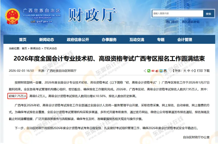 2026年,广西考区初、高级会计资格考试报名人数共7.95万人,其中:初级7.75万人,高级0.2万人。高级会计资格考试报名人数同比增长10.58%,报名人数创历史新高。