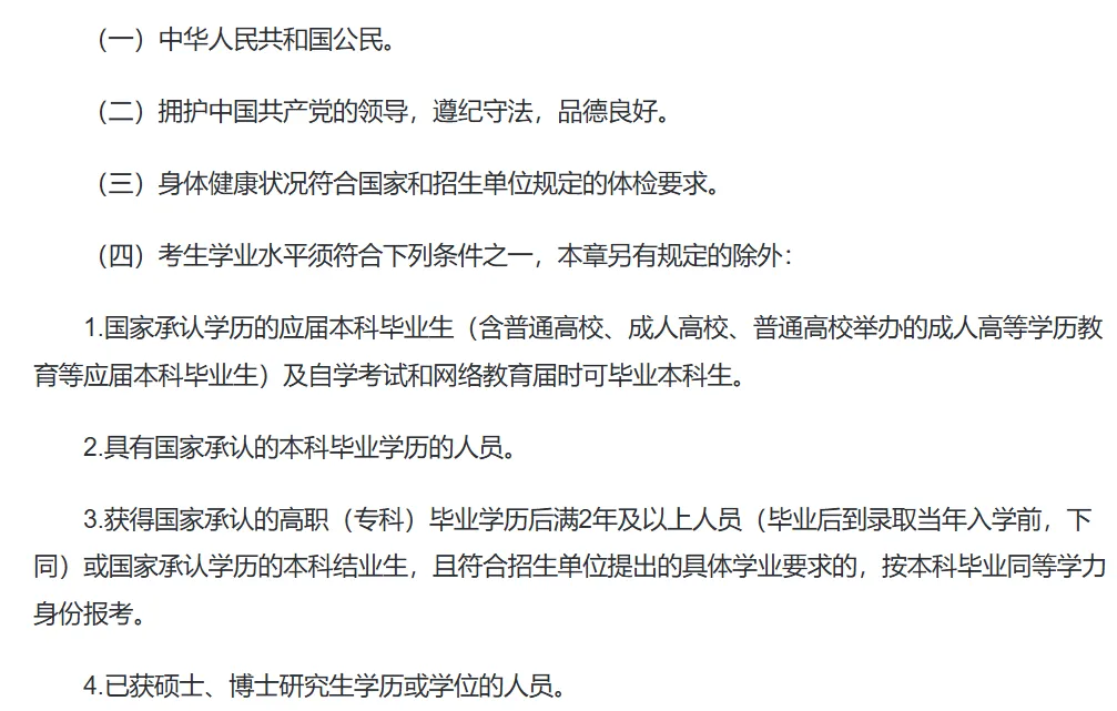 讲到这里,肯定有人会问:到底哪些人符合报名条件,能参加考研呢?主要有四项条件,前两项我就不多说了,在座的各位基本都能满足。第三项是身体状况要符合国家和招生单位的要求,这个得看具体专业 —— 比如部分特殊专业对视力有要求,大部分专业对身体健康的限制其实没那么多。我们重点说第四项,这一项包含四类人群,满足其中一类就行:- 必须毕业满两年(实际入学前)才能报考,刚毕业的专科生是不能考的。而且很多招生单位不接受专科前置学历,专科生考研限制比较多,建议大家可以先提升成本科学历再考