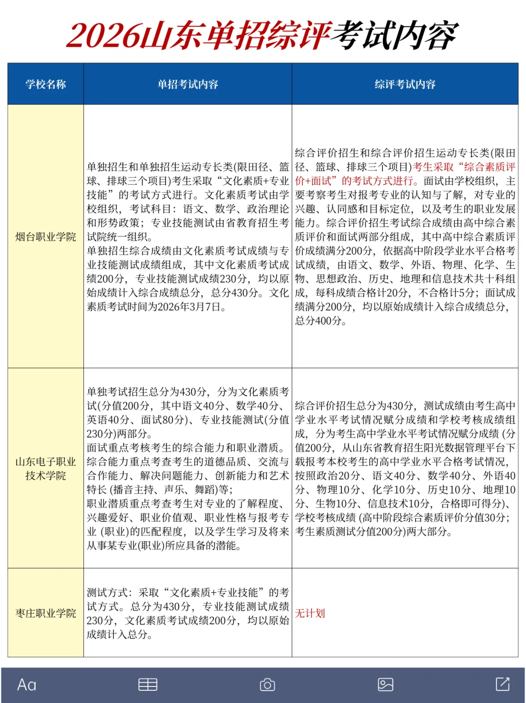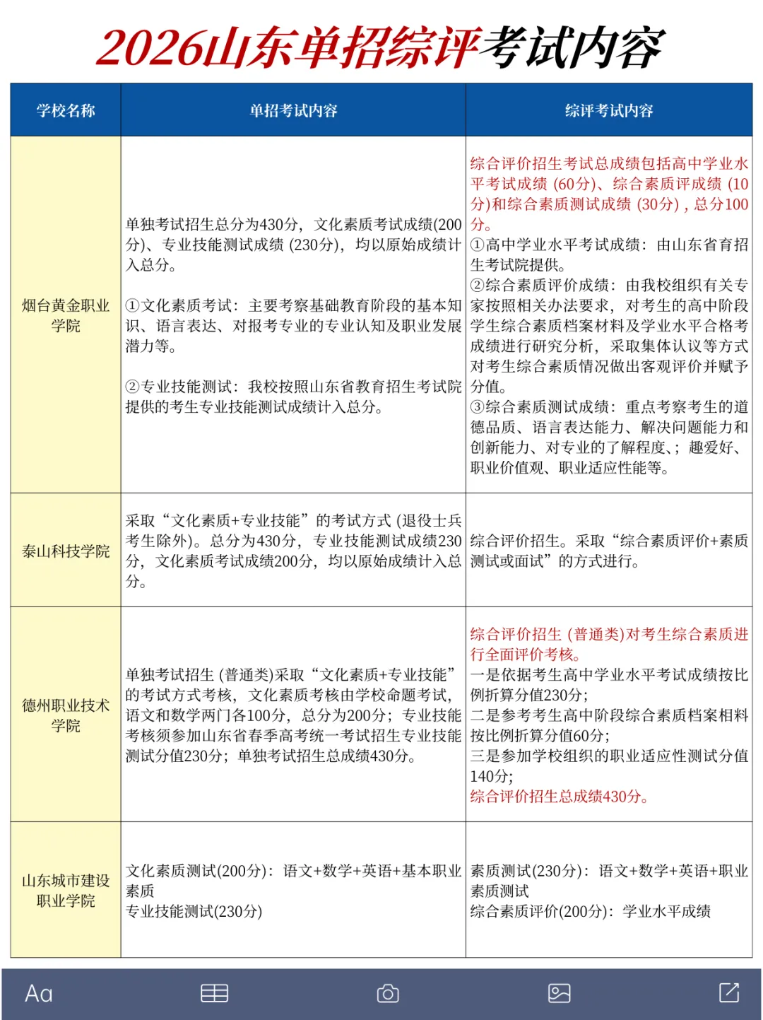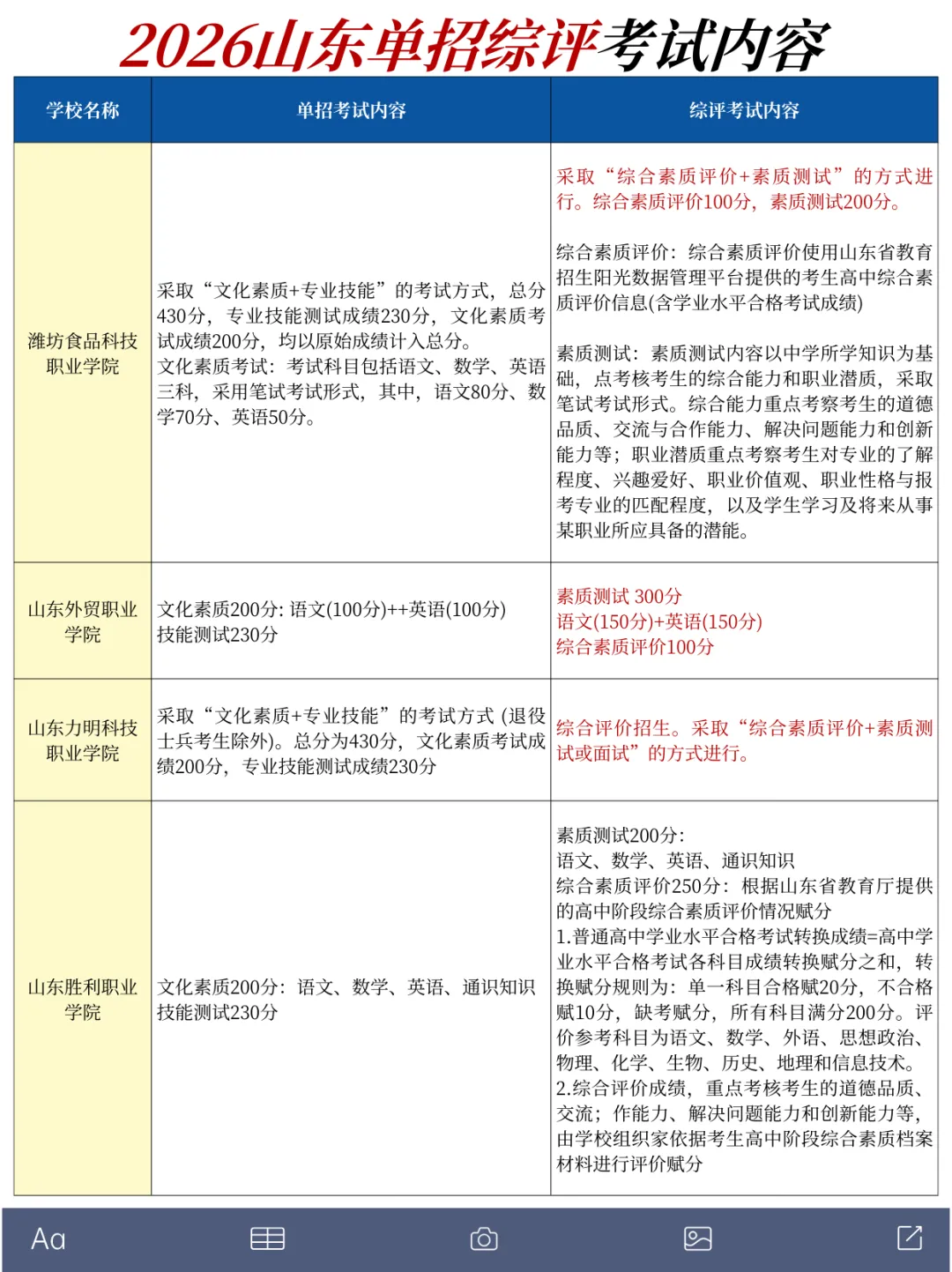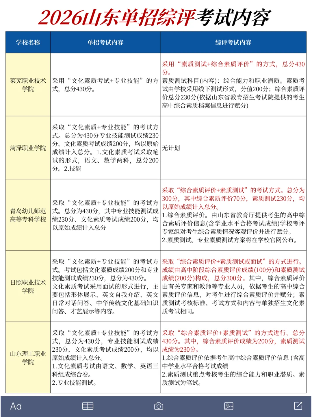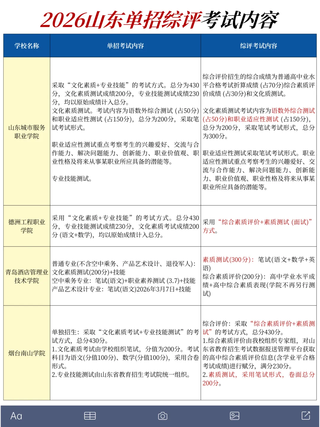 近日,山东省各高校陆续发布了2026年高职(专科)单独考试招生和综合评价招生的考试安排。为帮助广大考生和家长清晰了解不同学校的考核方式与内容,我们整理了多所高校的考试信息,涵盖单招与综评两大类别,供大家参考。