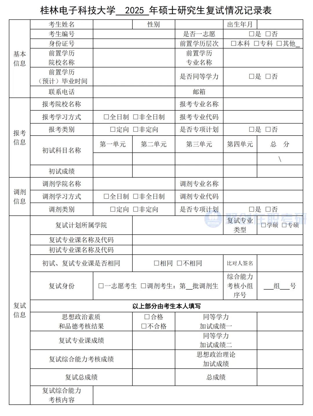 桂林电子科技大学-计算机与信息安全学院2025年研究生复试情况记录表分两个部分,第一部分是考生自行填写的内容,主要是考生个人的基础信息;第二部分是招生院校面试官填写。