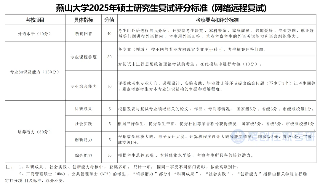 网络远程复试内容包括:外语水平(40分)、专业知识及能力(130分)、培养潜力(50分)。
