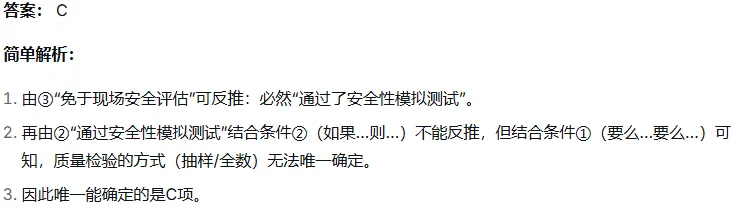 某公司规定,所有新产品必须通过质量检验和安全性评估才能上市。已知:① 要么进行质量抽样检验,要么进行全数检验;② 如果不进行全数检验,则必须进行安全性模拟测试;③ 只有通过安全性模拟测试,才能免于现场安全评估。目前,该产品免于现场安全评估。