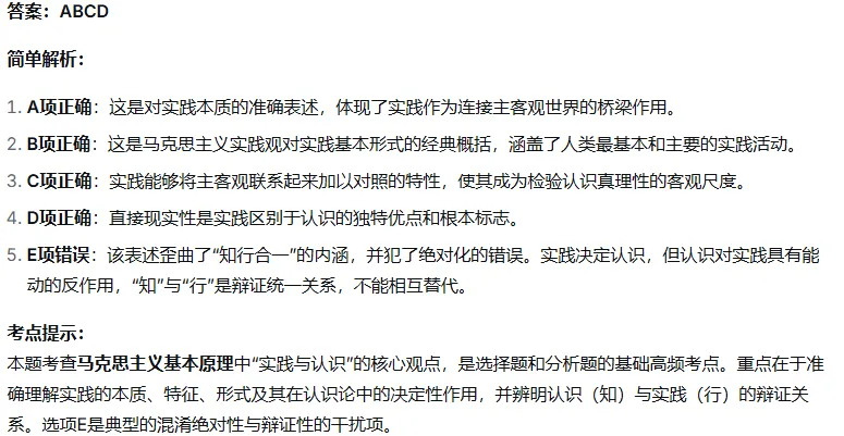 A. 实践是人类社会生活的本质活动,是“主观见之于客观”的活动B. 实践的基本形式包括物质生产实践、社会政治实践和科学文化实践C. 实践是检验真理的唯一标准,这是由真理的本性和实践的特点决定的D. 实践具有直接现实性,能够把观念的存在变为现实的存在E. 实践决定认识,因此“知行合一”中“行”可以完全替代“知”