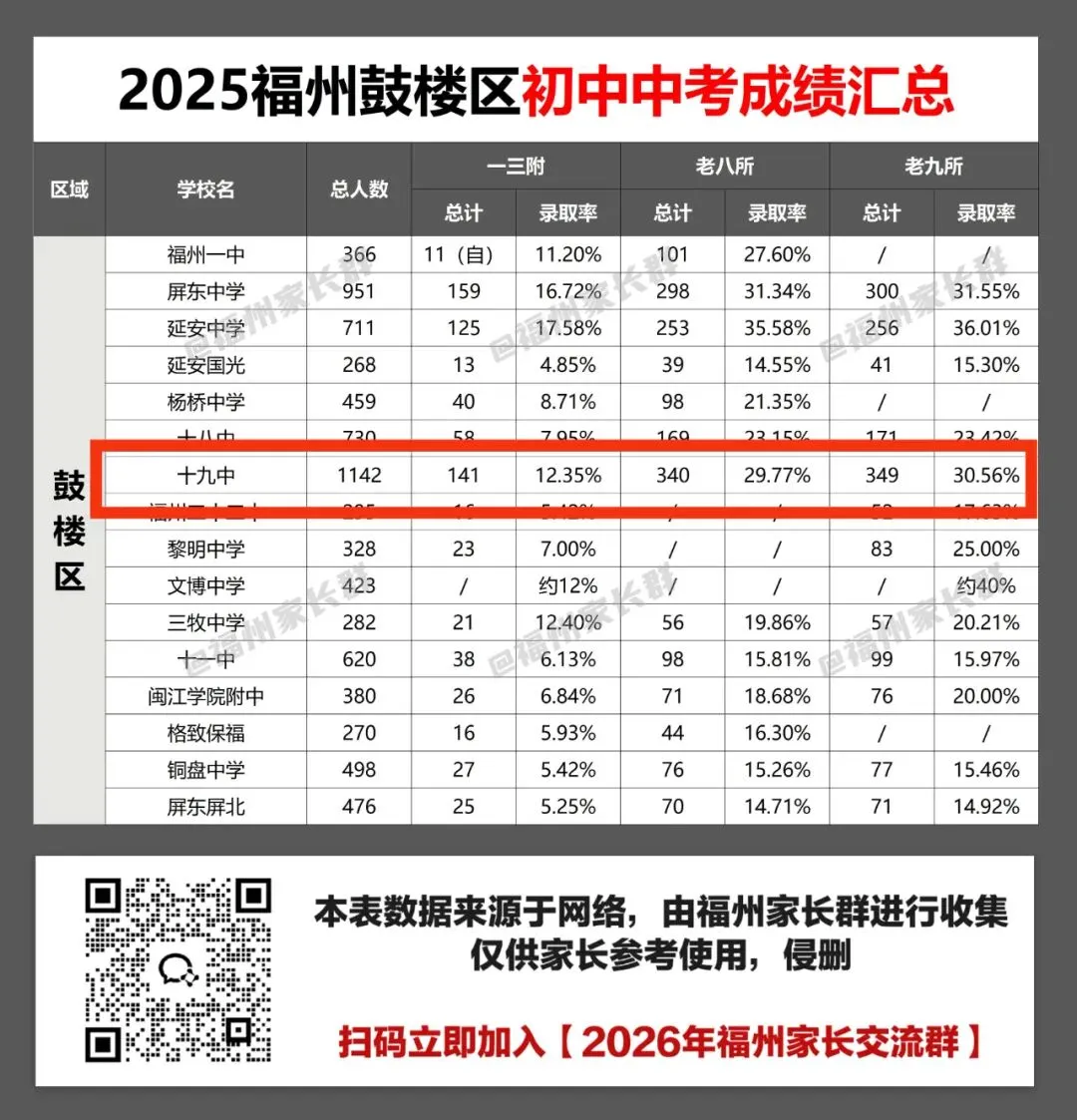 2025年福州十九中的中考成绩,一三附上线率12.35%,老八所上线率29.77%,这个数据放在整个鼓楼区都很能看,与延安、屏东包揽前三。