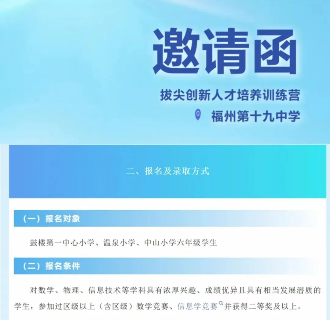 为进一步培养拔尖创新型人才,福州第十九中学面向对口小学招募对数学、物理、信息技术等学科有强烈兴趣的学生,进行贯通式培养,即开拓“小学—初中—高中”的贯通式路径。