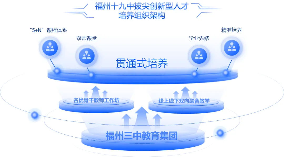对于拔尖创新型人才的培养,福州第十九中学以“福州三中教育集团”为依托,创建新型组织架构,通过集团“名优骨干教师工作坊”研发课程,通过线上线下双向融合教学,培养出具有高水平创新能力的学生。